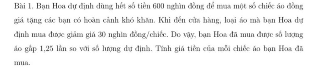 Vì số áo mà bạn Hoa đã mua được gấp `1,25` lần số áo bạn Hoa định mua nên ta có phương trình :
