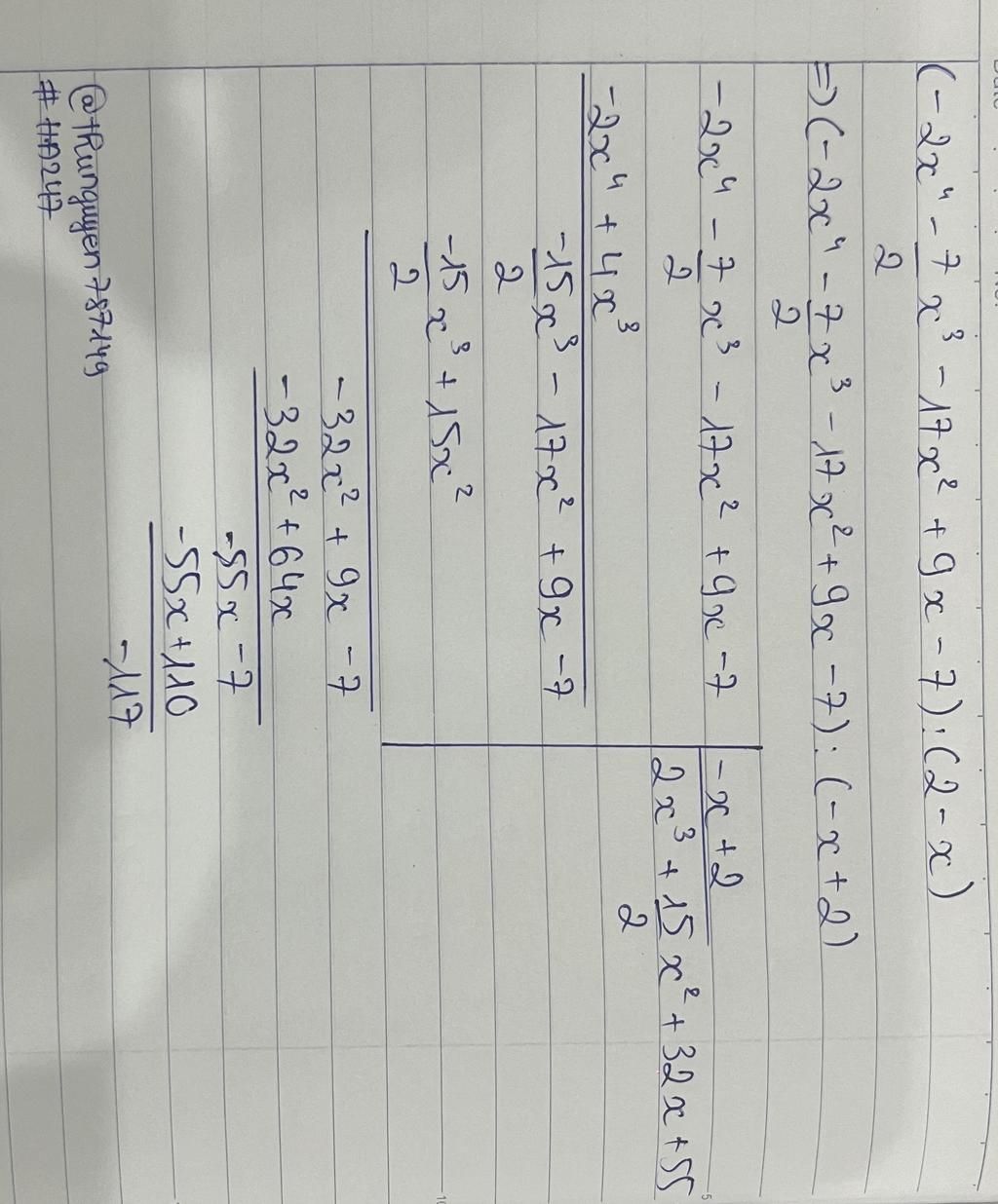 (-2x4 - 7/2x3 - 17x2 + 9x - 7) : (2 - x)làm đặt tính giúp e với ạ e cảm ơn