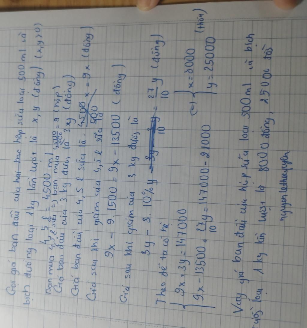 Đáp án: $1$ Hộp sữa: $8000$ đồng, $1$ bịch đường: $25000$ đồng