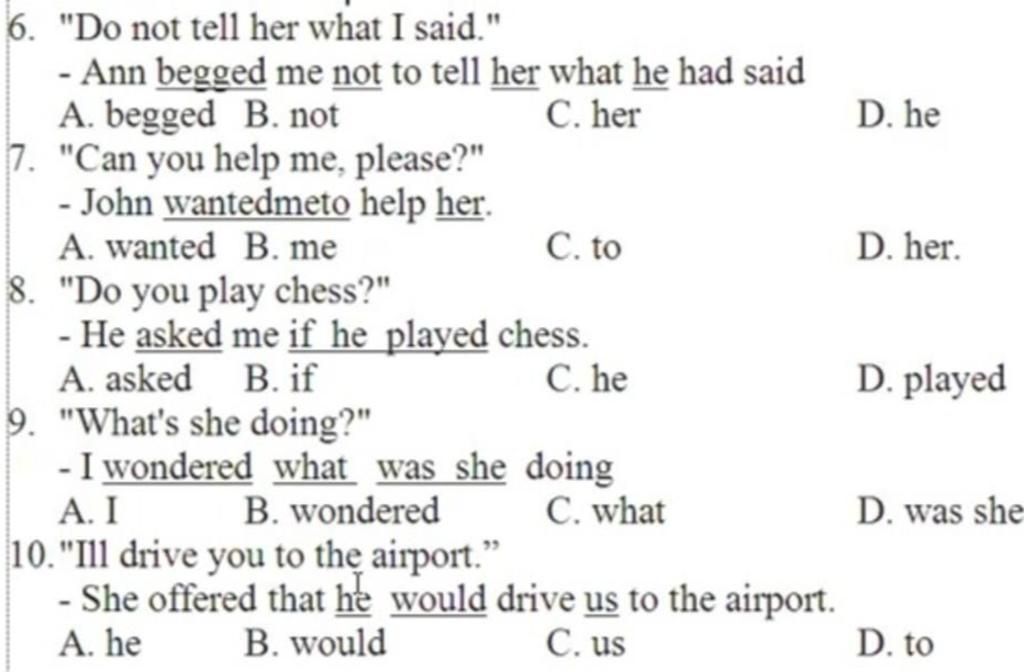 6. -> beg sb + to V - ing / not to V- ing ( cầu xin người đó làm gì / không làm gì) 7. -> want sb to V - ing ( nhờ ai đó làm gì ) 8. -> S + asked + O + if + S + V(lùi thì) 10. -> Câu trực tiếp