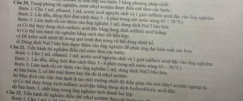 `->` đun sôi hỗn hợp làm cho các chất phản ứng `CH_3COOH,C_2H_5OH,H_2SO_4` đặc,... bay hơi
