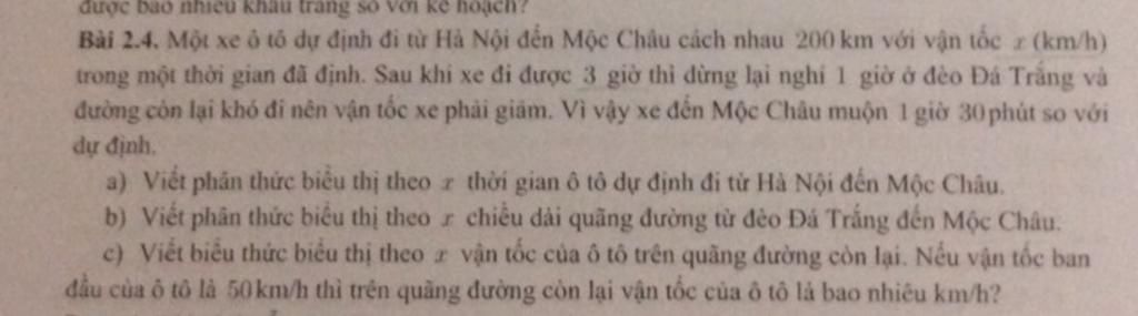 Thời gian đi từ đèo Đá Trắng đến Mộc Châu là: `200/x+1,5-3-1=200/x-2,5(h)`
