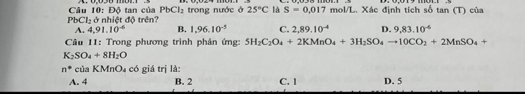Câu 10: Độ tan của PbCl2 trong nước ở 25°C là S = 0,017 mol/L. Xác định tích số tan (T) của PbCl2 ở nhiệt độ trên?