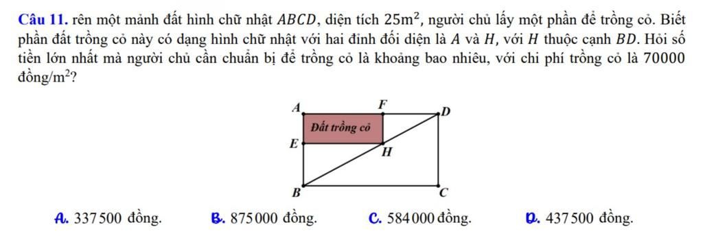 $\to$Chi phí trồng cỏ lớn nhất là:
