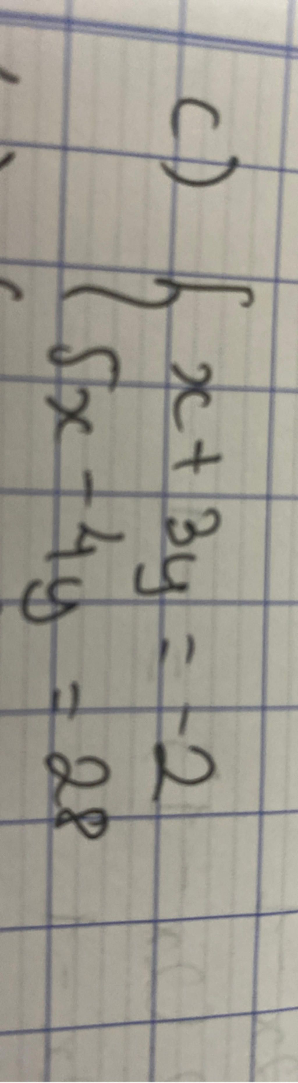 `{(x+3y = -2 ),(5x -4y=28):}`