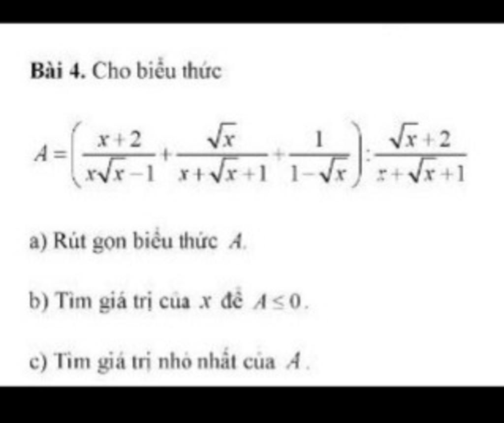 $\to A=\dfrac{x-2\sqrt{x}+1}{(\sqrt{x}-1)(x+\sqrt{x}+1)}\cdot\dfrac{x+\sqrt{x}+1}{\sqrt{x}+2}$