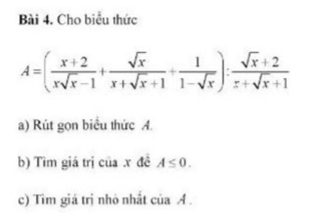 `A = [{x+2}/{(\sqrt{x})^3 - 1} + {\sqrt{x}}/{x + \sqrt{x} +1} - 1/{ \sqrt{x} - 1}] : {\sqrt{x} +2}/{x + \sqrt{x} +1}`