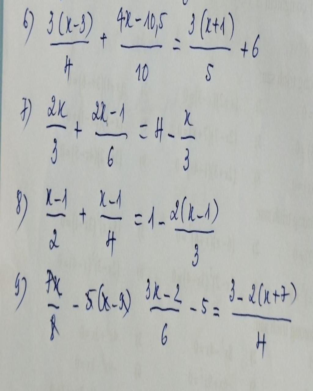 `6)` `(3(x - 3))/4 + (4x - 10,5)/10` `= (3(x + 1))/5 + 6`