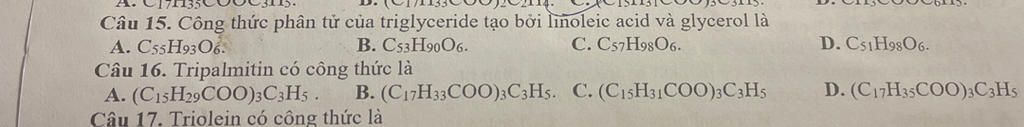 Câu 15. Công thức phân tử của triglyceride tạo bởi linoleic acid và glycerol là