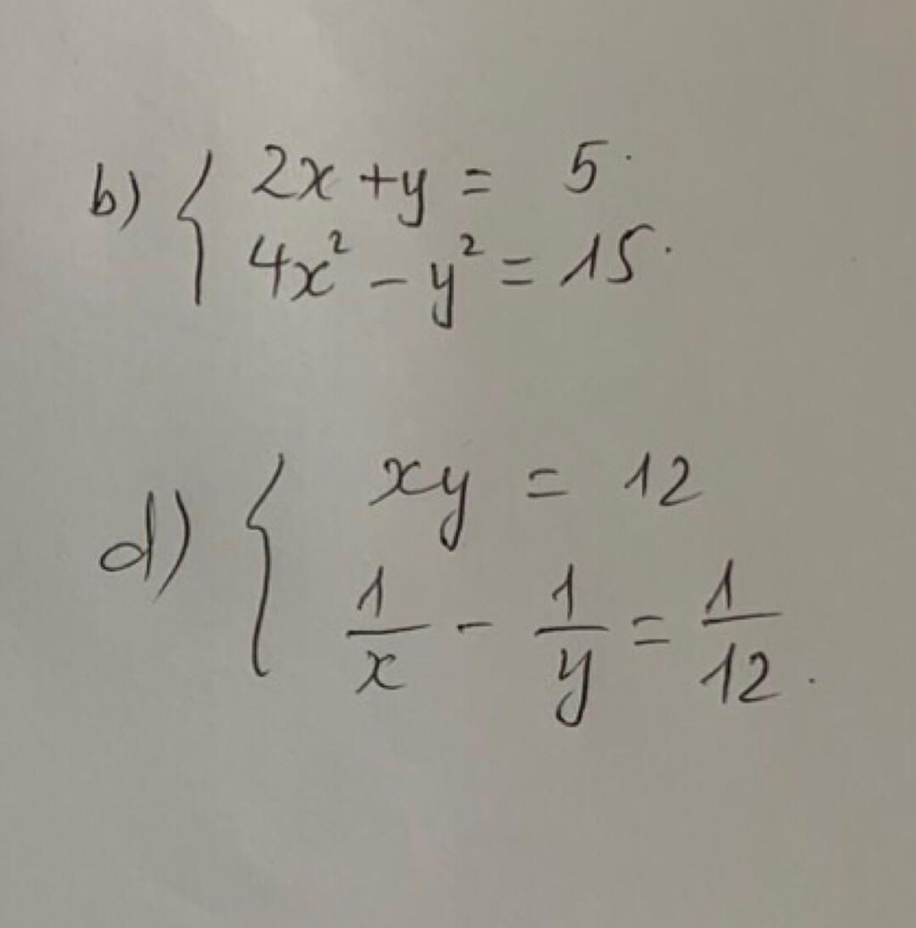`b)``{(2x+y=5),(4x^2 -y^2 =15):}`