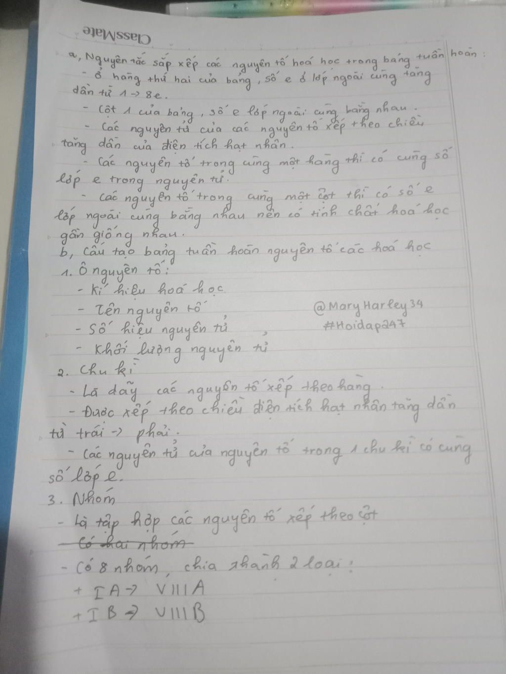 `-` Bảng tuần hoàn nguyên tố hoá học được cấu tạo bởi : 7 hàng ngang gọi là chu kỳ và 18 cột dọc gọi là nhóm . Các hàng ngang tương ứng với các chu kỳ củ electron trong nguyên tử , còn các cột dọc tương ứng với các nhóm nguyên tố có cùng cấu hình electron trong lớp ngoại cùng .