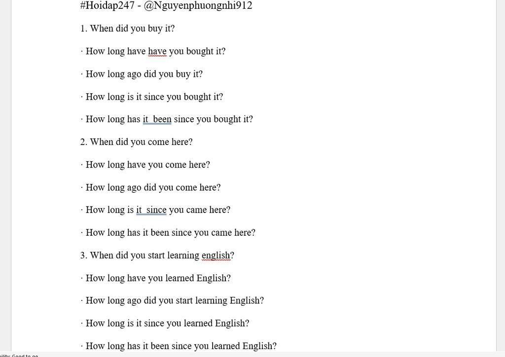 V. Biến đổi câu: when did ==> How long have + V3...hoặc How long ago đi hoặc : How long is it since...