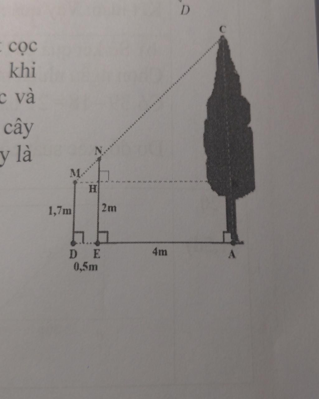 Một người đo chiều cao của một cây nhờ một cọc chôn xuống đất, cọc cao 2m và đặt xa cây 4m. Sau khi người ấy lùi ra xa cách cọc 0,5m thì nhìn thấy đầu cọc và đỉnh cây cùng nằm trên một đường thẳng. Hỏi cây cao bao nhiêu, biết rằng khoảng cách từ chân đến mắt người ấy là 1,7m?