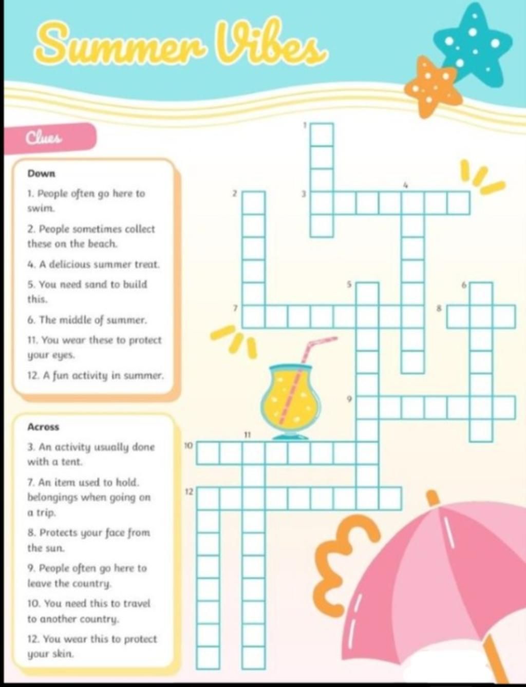 12. A fun activity in summer: (SWIMMING)