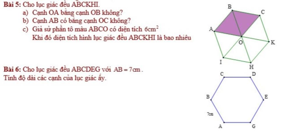 `5)a. OA = OB` do đây là hình lục giác đều `ABCDKHI` nên các đường chéo sẽ bằng nhau hay các nửa đường chéo sẽ bằng nhau.