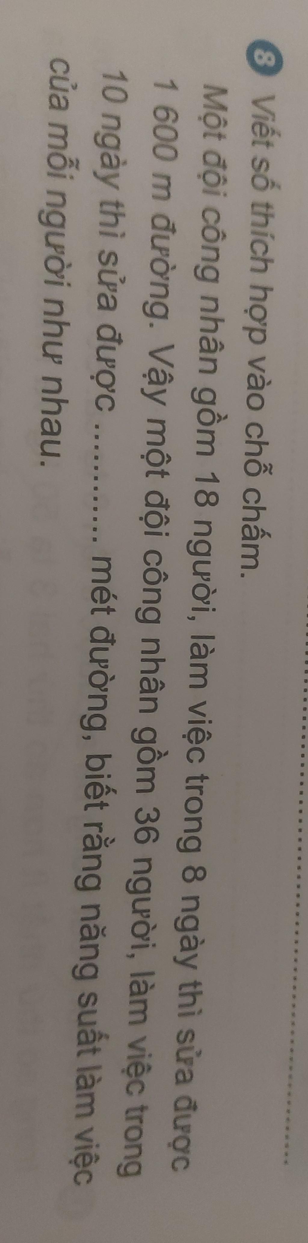 `36` người làm trong `10` ngày thì sửa được số mét đường là: