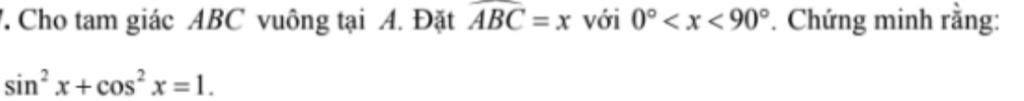 Do đó: sin^2x+cos^2x = AC^2/BC^2 + AB^2/BC^2 = (AC^2+AB^2)/BC^2 mà AC^2+AB^2 = BC^2 ( Định lý Py-ta-go )