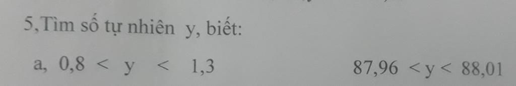 Đáp án:`a)0,8<y<1,3`vì `y` là số tự nhiên `(0,1,2,3,...)`thì ta được:`0,8<1<1,3`Vậy: `y=1````87,96<y<88,1`vì `y` là số tự nhiên `(0,1,2,3,...)`thì ta được: `87,96<88<88,1`Vậy: `y=88`