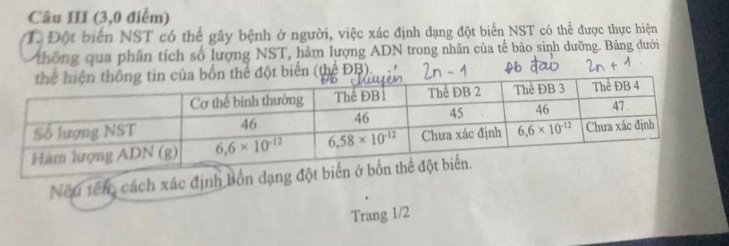 Thể đột biến 3: Số lượng NST Số lượng và hàm lượng ADN không đổi-> Đột biến gen, đb cấu trúc NST dạng đảo đoạn.