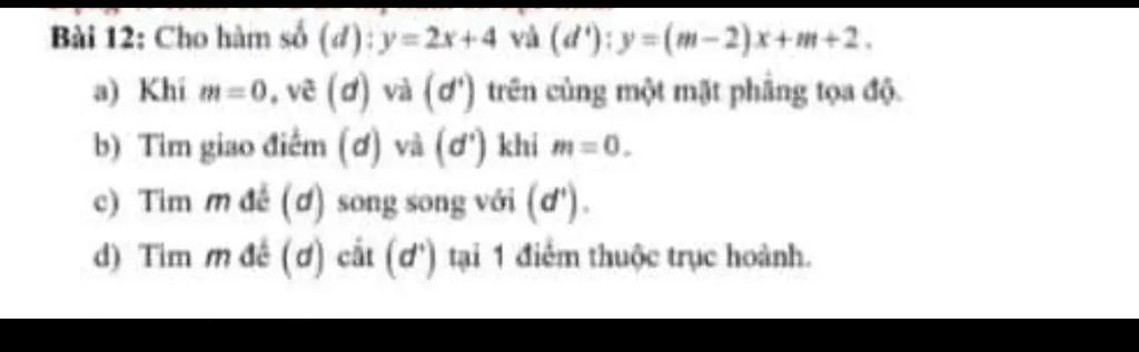 `d)` Để `(d)` cắt `(d')` tại điểm trên trục hoành
