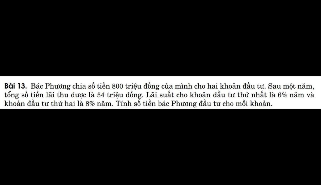 $\to \begin{cases}x+y=800\\0.06x+0.08y=54\end{cases}$