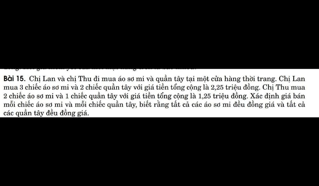 Chị Thu mua `2` chiếc áo sơ mi và `1` chiếc quần tây với giá tiền tổng cộng là `1,25` triệu đồng
