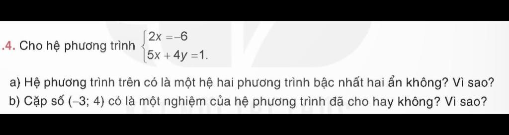 `a)` Hệ phương trình $\begin{cases} 2x=-6\\5x + 4y=1 \end{cases}$ là hệ phương trình bậc nhất hai ẩn vì có thể viết về dạng:
