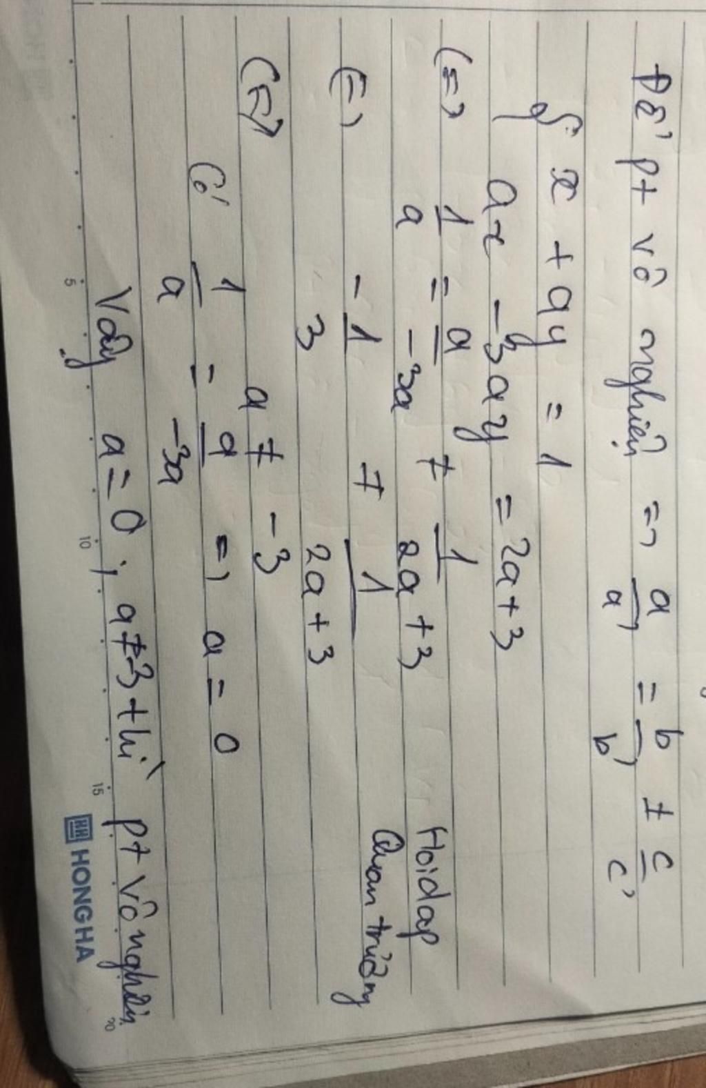 `-` Để hệ phương trình vô nghiệm thì `1/a=1/-3` `<=>a=-3`