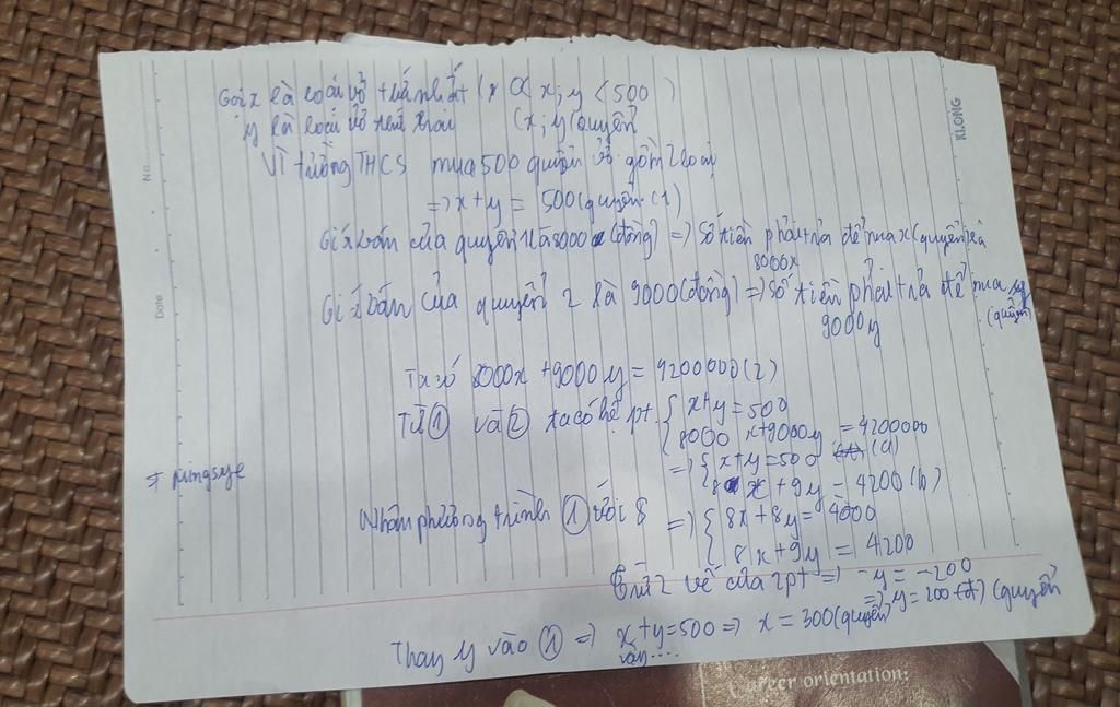 Một trường THCS mua 500 quyển vở gồm hai loại. Giá bán hai loại vở lần lượt là 8000 đồng và 9000 đồng. Hỏi nhà trường đã mua mỗi loại bao nhiêu vở? Biết rằng tổng số tiền mua vở là 4 200 000 đ.