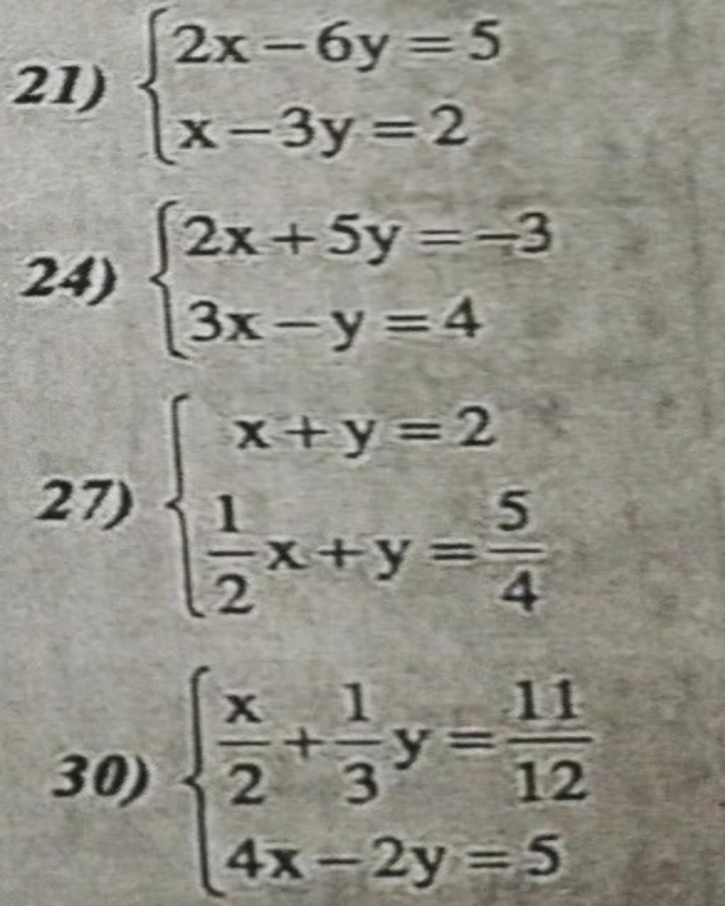 `21) {(2x - 6y = 5),(x - 3y = 2):}`