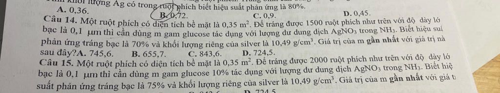 *Yêu cầu bài này là tìm $V_{Ag}$ để tráng được $1500$ ruột phích. Xem $1$ ruột phích có $S=0,35m^2$ và $h=0,1\mu m$ thì $V=S.h$ (công thức tính thể tích bên toán)