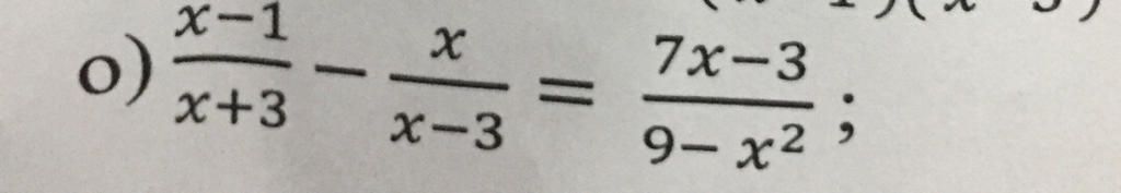 `o,` Ta có: `(x - 1)/(x + 3) - x/(x - 3) = (7x -3)/(9 -x^2)` (Đk:`x \ne +-3`)