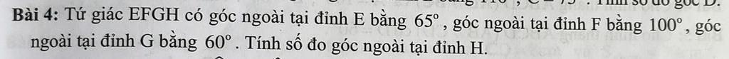Vậy góc ngoài tại đỉnh H bằng `180^o - 45^o=135^o`