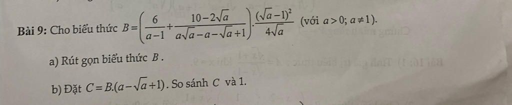 `=> B = (6/(a - 1) + (10 -2\sqrt{a})/(a(\sqrt{a} -1) - (\sqrt{a} - 1))) . ((\sqrt{a}-1)^2)/(4\sqrt{a})`