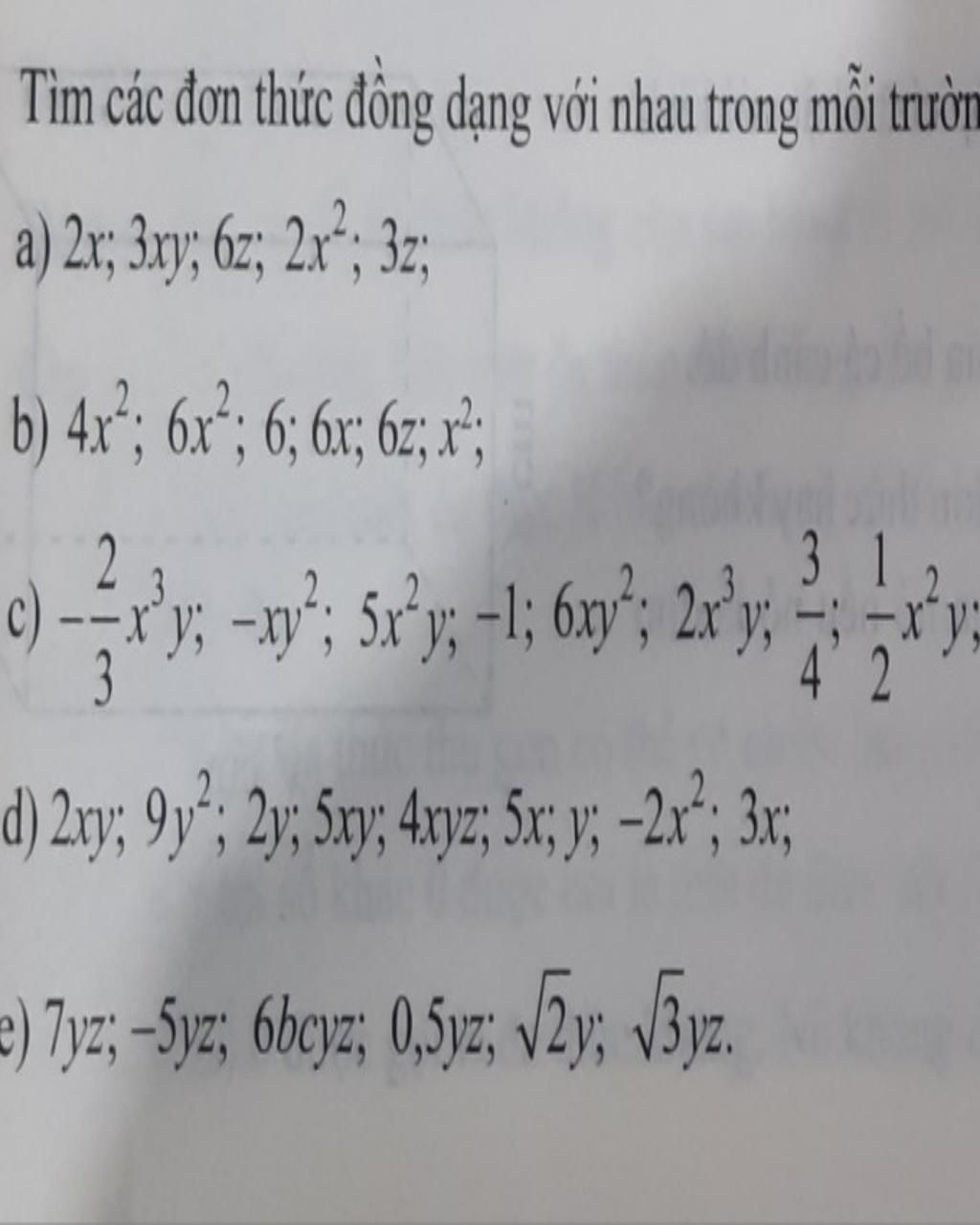`e,` `7yz ; -5yz ; 0,5yz` và `\sqrt{3}yz`
