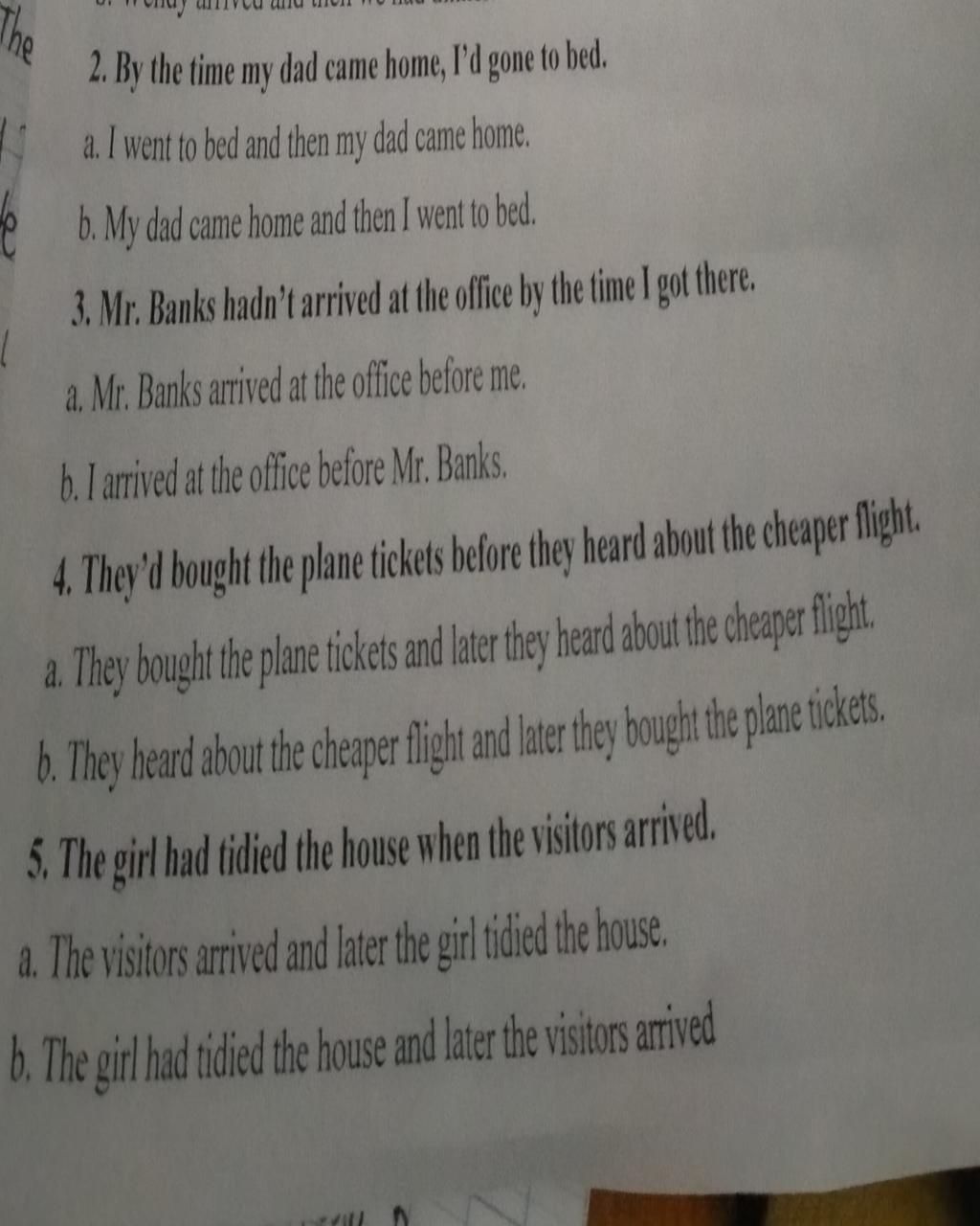 `->` Ở câu trên hành động "I went to bed" xảy ra trước vì chia QKHT và hành động "My dad came home" xảy ra sau vì chia QKĐ
