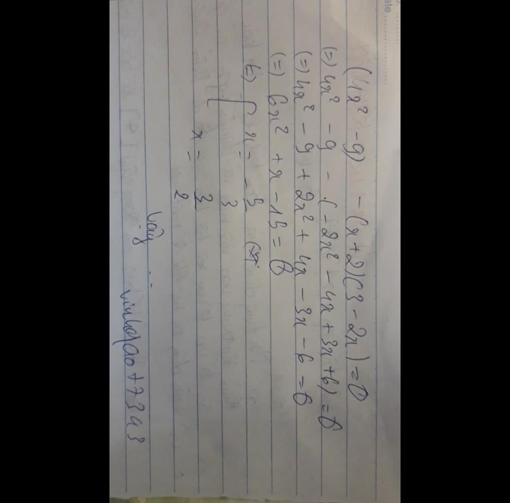 `(4x^2 -9)-(x+2)(3-2x)=0`