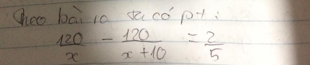 `(120)/x - (120)/(x + 10) = 2/5` (Đk:`x \ne 0;x \ne -10`)
