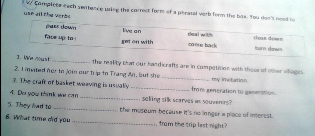 - come back (phr v) quay về ~ return (v)