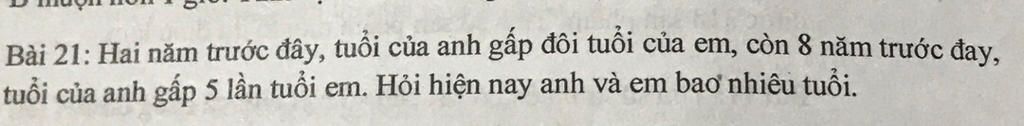 Vậy tuổi anh: `18` tuổi ; tuổi em: `10` tuổi
