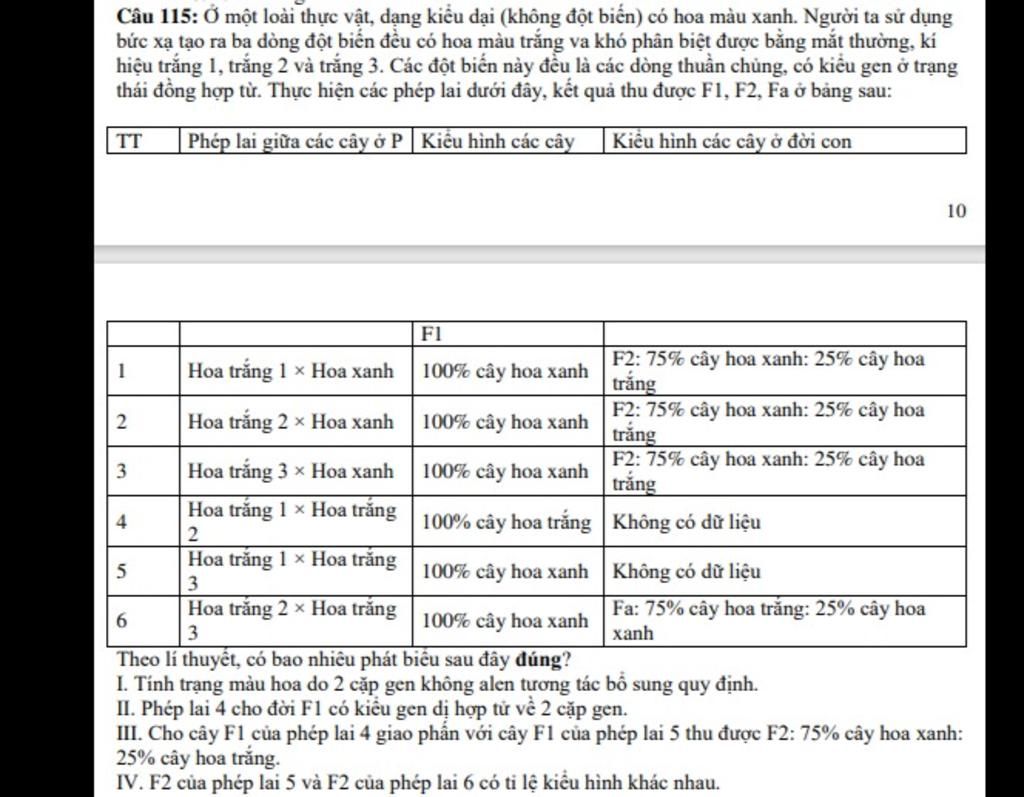 Câu 115: Ở một loài thực vật, dạng kiểu dại (không đột biến) có hoa màu xanh. Người ta sử dụng