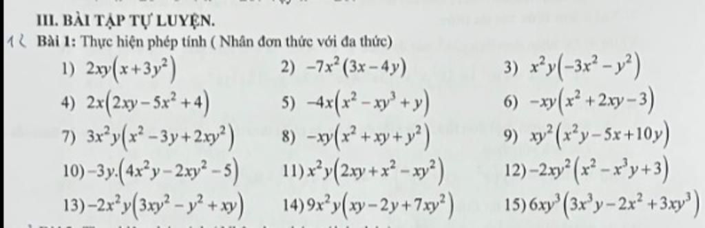 `7)` `3x^2y ( x^2 - 3y + 2xy^2 )`