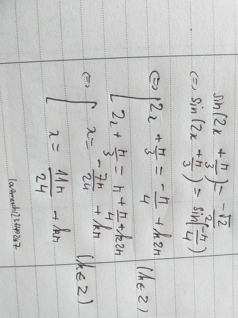`<=> sin (2x +pi/3)=sin(-pi/4)`