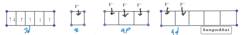 `*` Ta thấy khả năng tương tác của phối tử $\rm F^-$ bé hơn $\rm NH_3$ suy ra ion phức có spin cao, các `e` phân bố đều trên các orbital