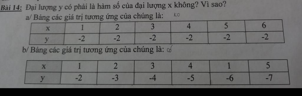 `14)a.` Đại lượng `y` là hàm số của `x` vì `AAx in RR` thì `y` luôn bằng `-2`(y phụ thuộc x)