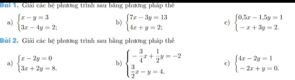 `b)` $\begin{cases} \dfrac{-3}{4}x+\dfrac{1}{2}y=-2\\\dfrac{3}{2}x-y=4 \end{cases}$