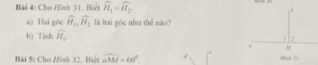 `a)` Hai góc `\hat{H_1}`; `\hat{H_2}` là hai góc kề bù.
