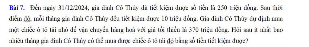 Vậy số tháng ít nhất gia đình Cô Thúy có thể mua được chiếc ô tô tải đó là `12` tháng
