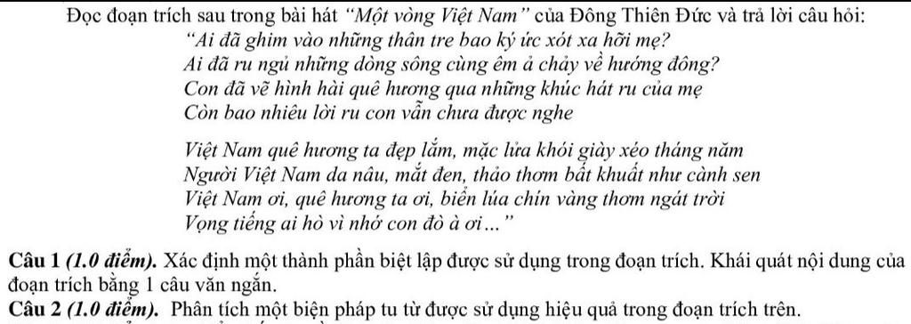 Thành phần biệt lập: Thành phần gọi đáp: ''Việt Nam ơi, quê hương ta ơi''
