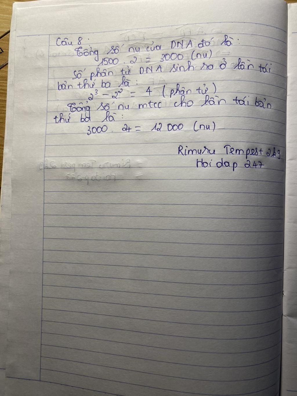 Câu 8: Một DNA của sinh vật nhân thực có 1500 cặp nucleotide tái bản 3 lần liên tiếp. Để tiến hành đợt tái bản cuối cùng, môi trường tế bào phải cung cấp thêm tất cả bao nhiêu nucleotide